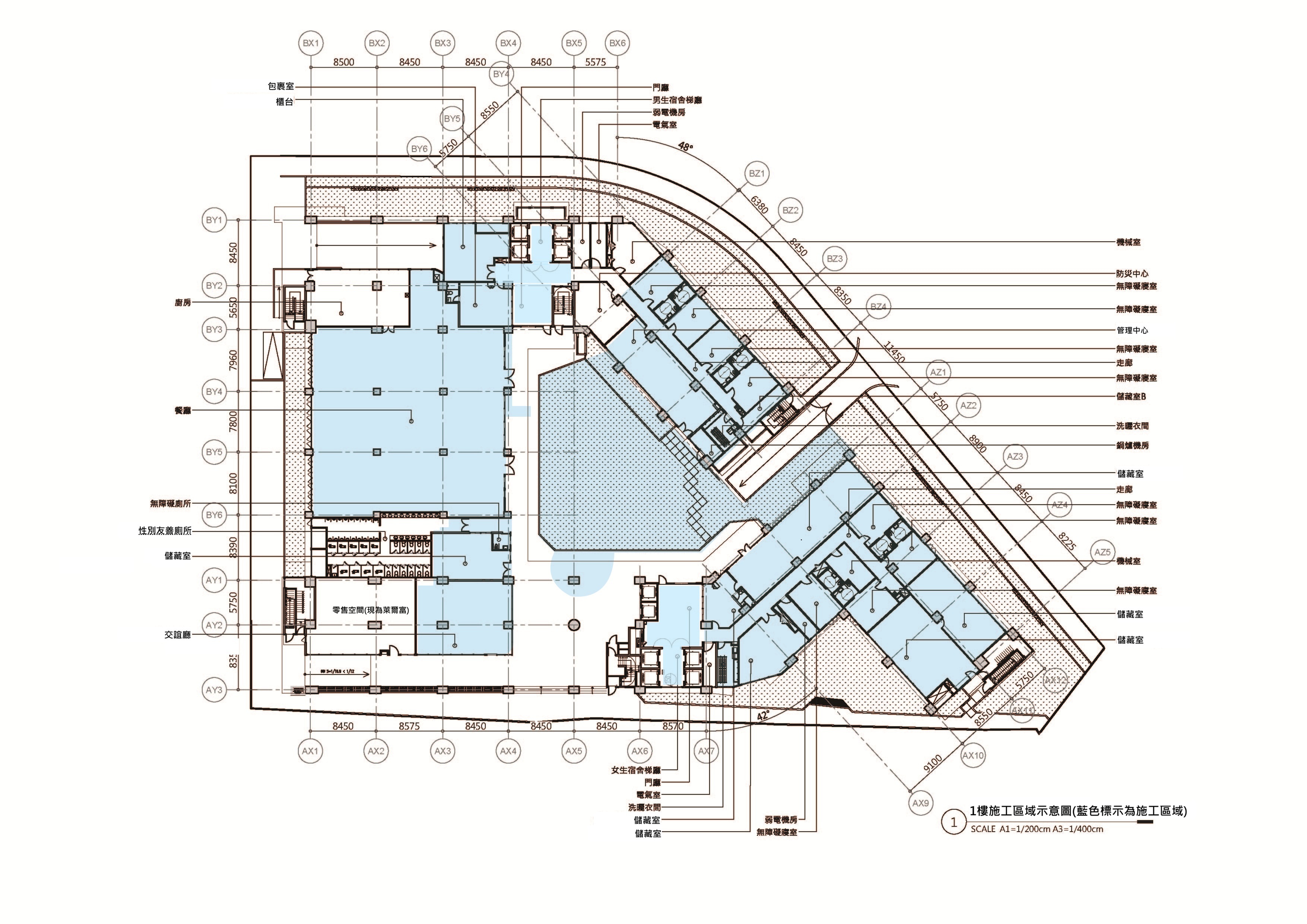 - 1樓:交誼廳、餐廳(不含廚房)、櫃台、包裹室、梯廳、管理中心、無障礙寢室、儲藏室及戶外廣場。(詳附圖1)