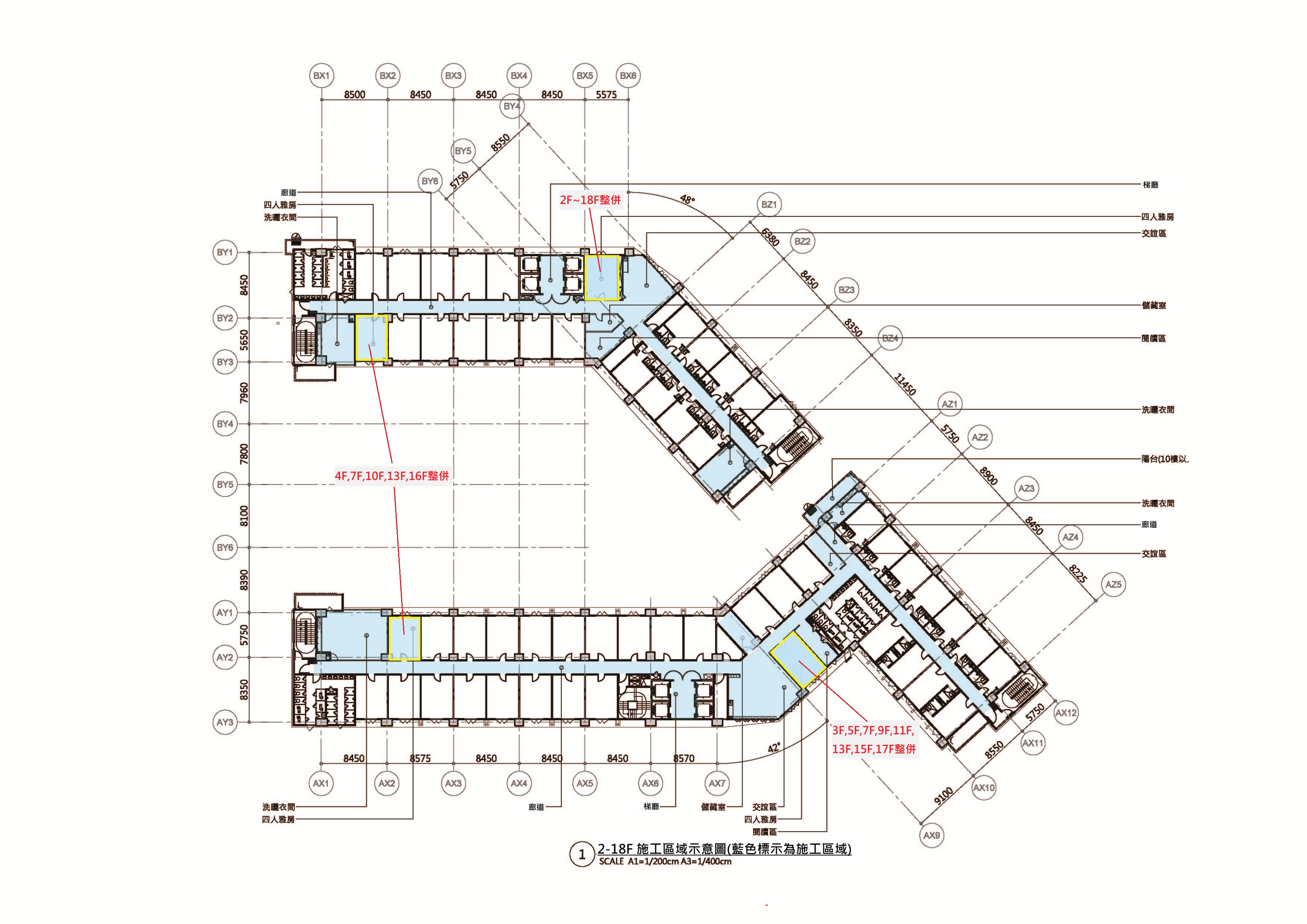 - 為兼顧同學住宿及工程進行,2~18樓擬規劃採「一次三層樓」為單位,由高樓層(18樓)向下分層輪替施工。