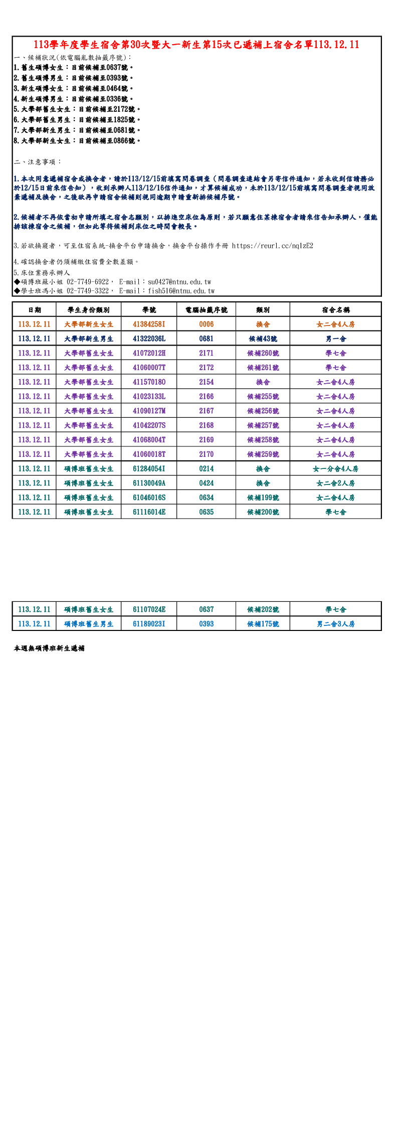 2024-12-11113學年度學生宿舍第30次已遞補上宿舍名單113.12.11