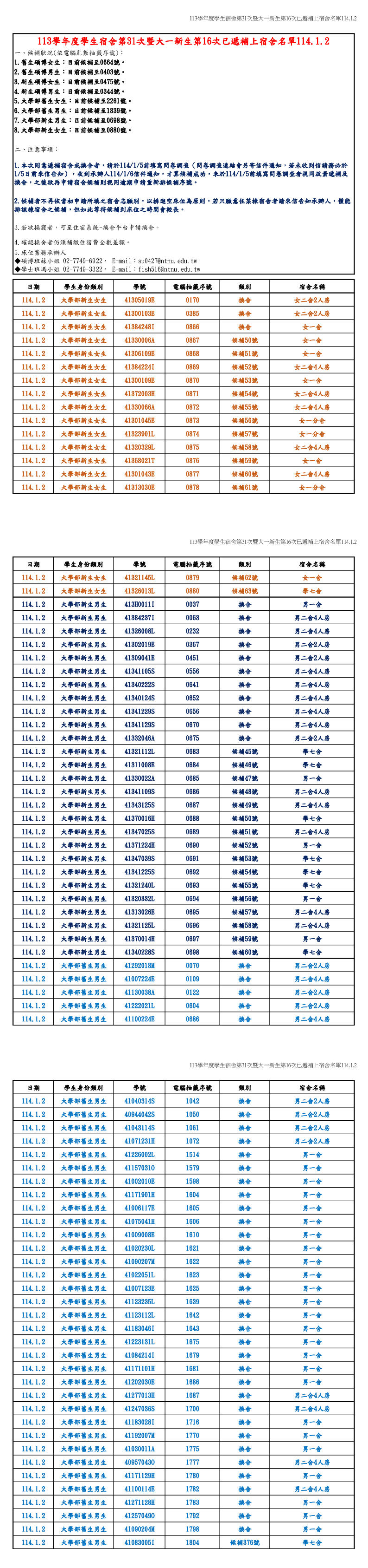 2025-01-02113學年度學生宿舍第31次已遞補上宿舍名單114.1.2